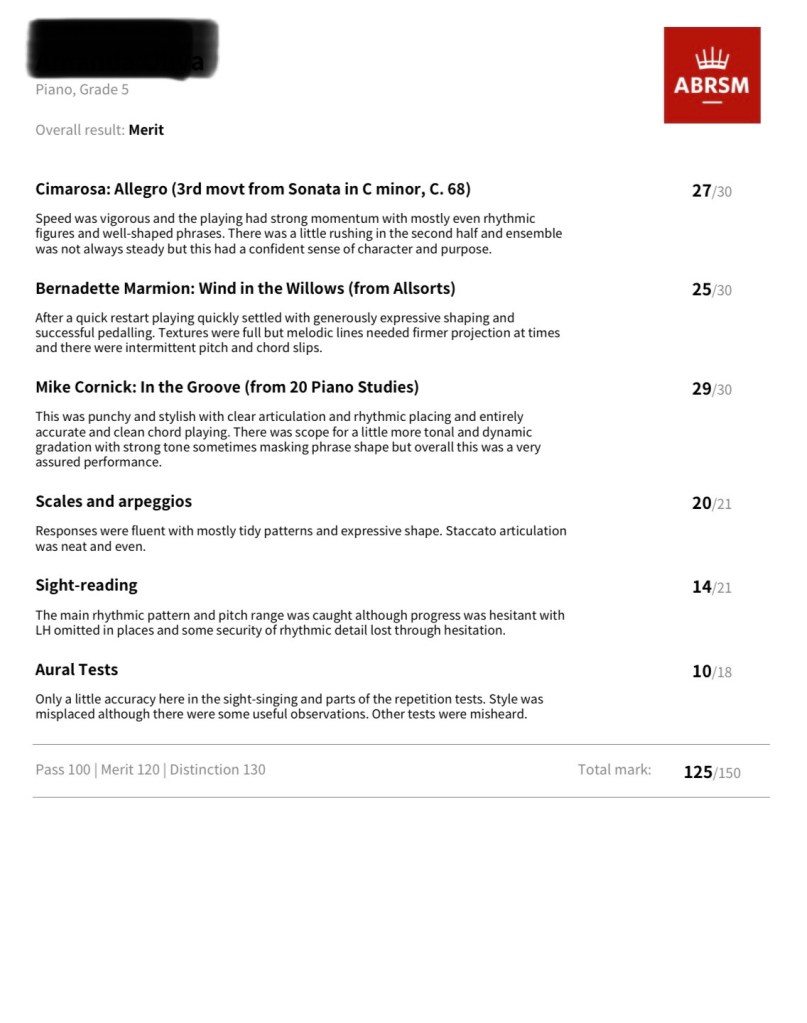 Piano Grade 5 ABRSM, 125 Marks, Merit