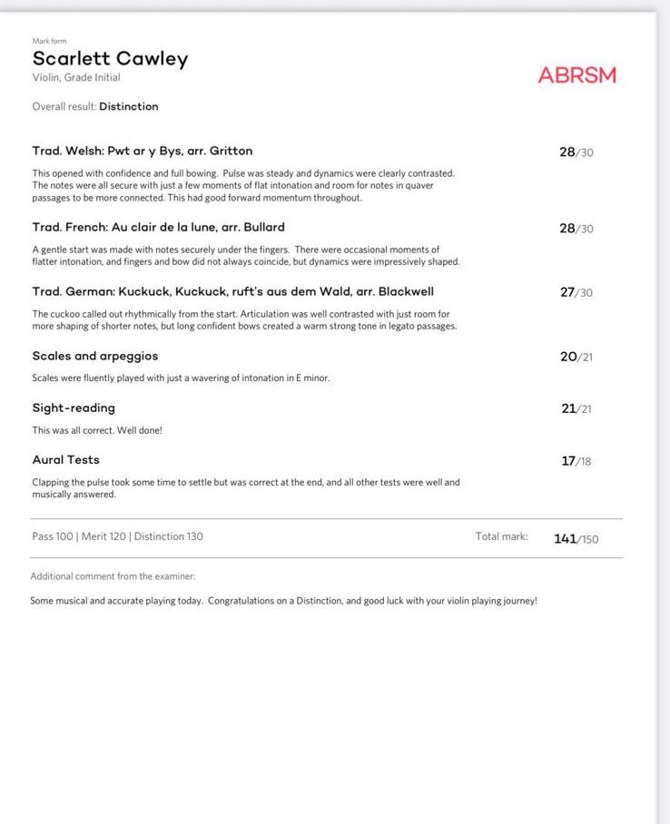 Violin Inital Grade ABRSM, 141 Marks Distinction